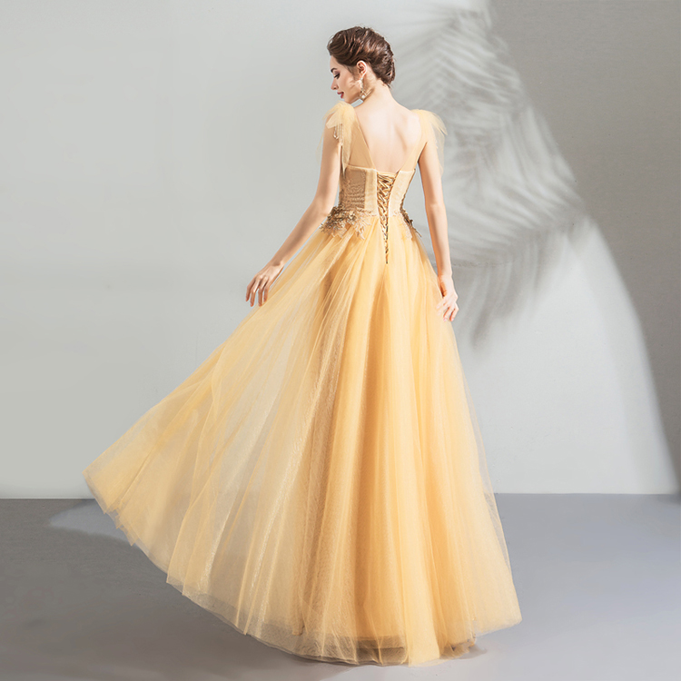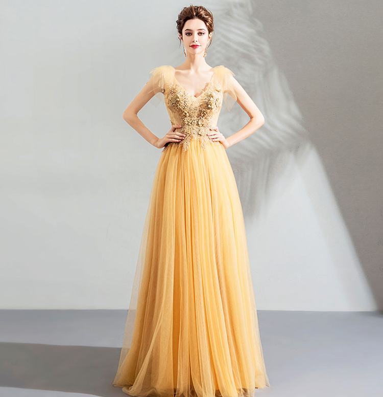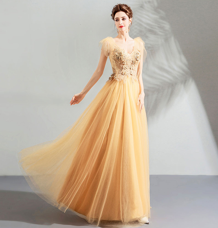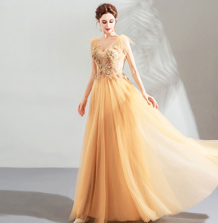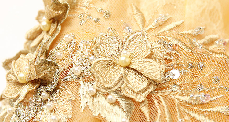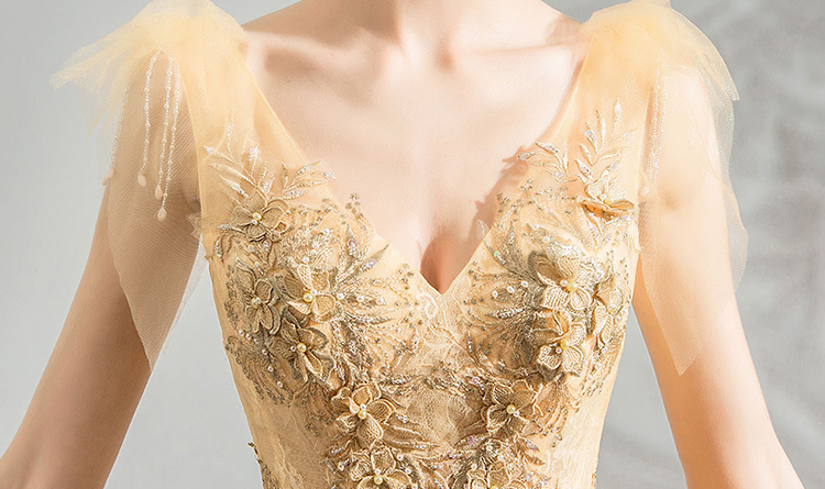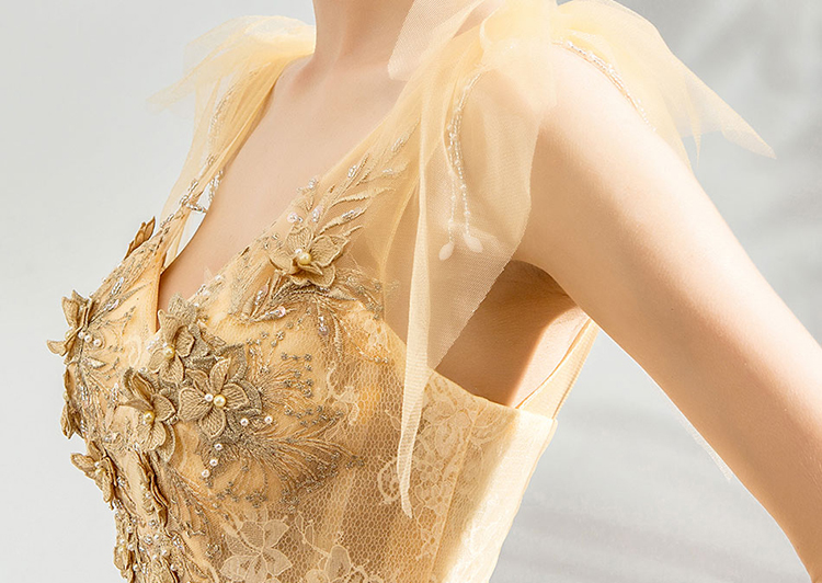 This dress features a lace and v-neck; Alluring deep v-neck with embroidery flowers; A-line silhouette.