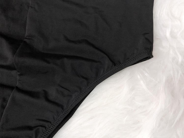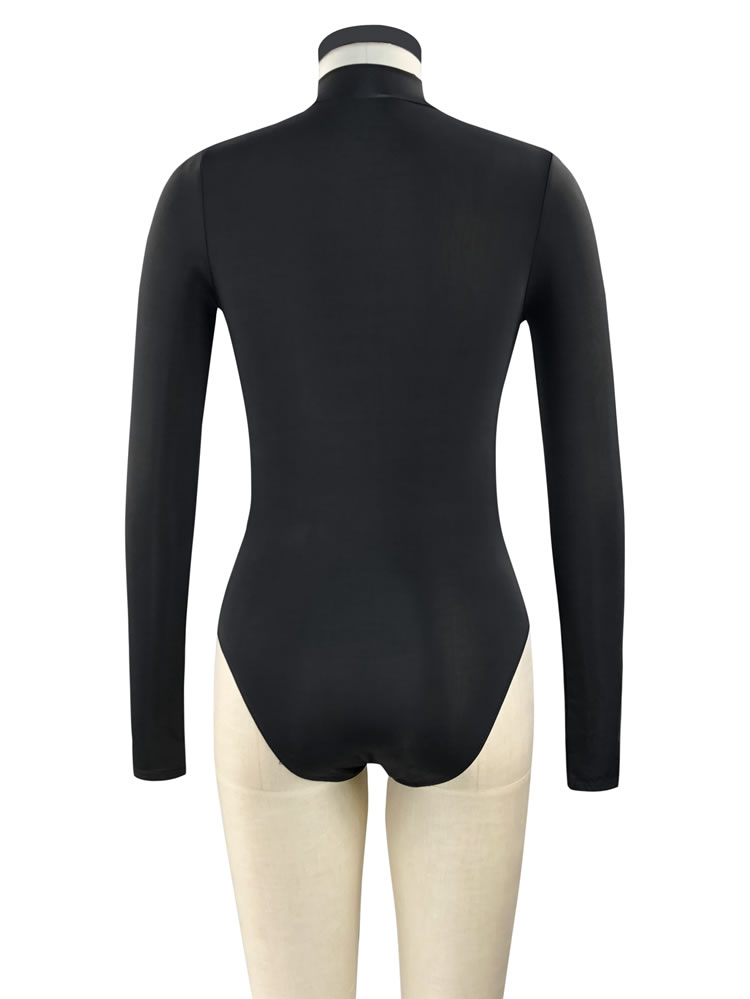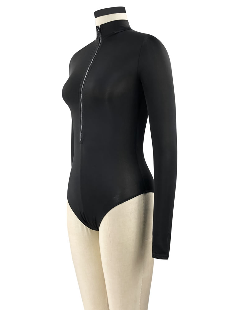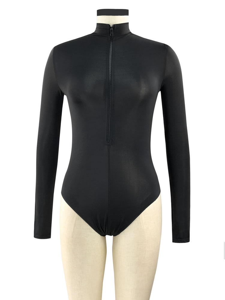 Take a dip in sophisticated style in this sexy one piece swimsuit featuring a plunging neckline with a zipper closure, long sleeves, high cut sides, and a cheeky cut back.